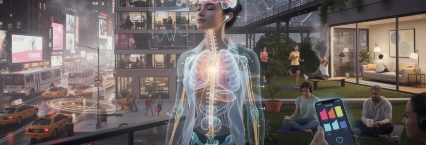 Montres connectées, bagues intelligentes et bracelets de suivi cardiaque se sont imposés dans le quotidien des habitants. Ces dispositifs collectent des données précises sur la fréquence cardiaque, la variabilité du rythme cardiaque (HRV), la qualité du sommeil ou encore le niveau d’activité physique. Couplés à des applications de biofeedback, ils permettent de visualiser concrètement l’impact des situations urbaines stressantes : une réunion tendue à Midtown, un trajet chaotique sur la ligne 4/5/6, une nuit écourtée par les sirènes.