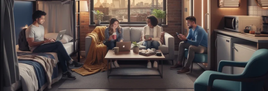Les espaces de coliving, portés par des acteurs comme Common ou Ollie, se sont fortement développés à New York ces dernières années. Leur concept ? Proposer des chambres meublées dans des appartements partagés ou des résidences avec de nombreux services inclus : wifi, ménage des parties communes, parfois même Netflix, salle de sport ou événements communautaires. Les baux sont en général flexibles, à partir d’un mois, ce qui convient parfaitement aux séjours moyens termes (vacances longues, stages, télétravail).